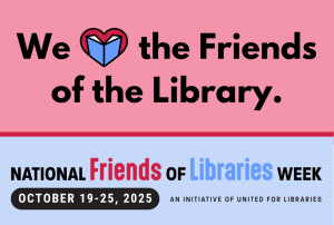 The Friends of the Library welcome all who wish to contribute—whether by volunteering time, attending events, or supporting our fundraising efforts. Celebrate with us in October during National Friends of the Library Week with special in-library events!